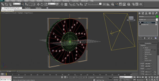 用一张特殊的凹凸贴图,选择盘式制动器的所有边缘,添加UVM的Plane贴图(来自修改菜单)。这样可以确保贴图与盘式制动器的边缘更好的吻合。
