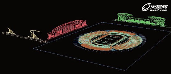阶梯观众席、中心体育场和遮雨棚几个大结构。在建模之前,首先观察CAD图纸资料,分析该体育场的详细结构。