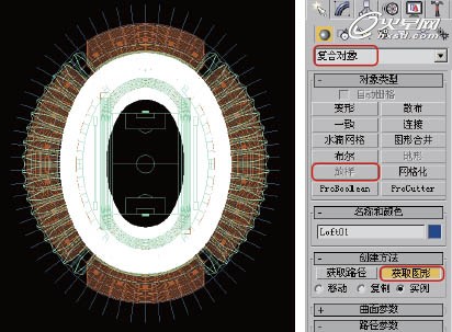 04.接下来进行[放样]操作。选择椭圆路径图形,然后在视图中单击拾取前面创建的观众席截面图形,如下图所示。