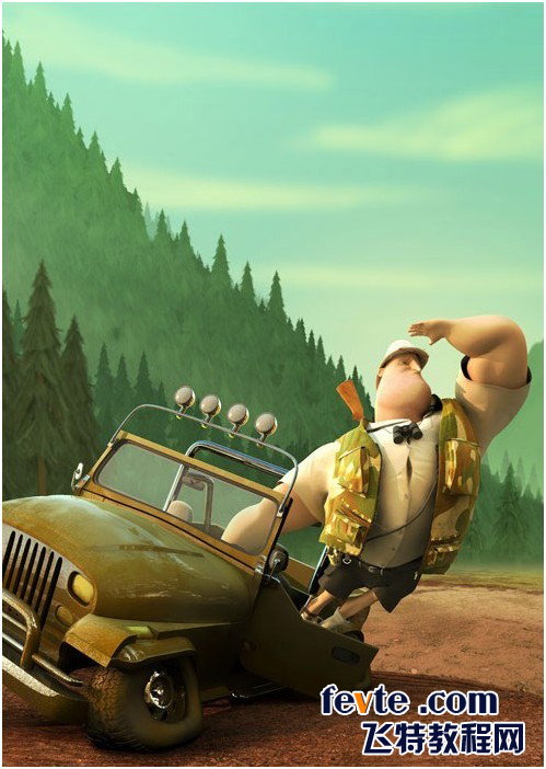 这个项目制作的开始阶段,我就想,我想要的是一个有趣滑稽的形象——与现实无关,只是一个具有一定个性的简单的人物形象。起初,我想制作一个拳击手,但是有些东西使我改变了主意……我开始寻找猎人形象的参考,找到后,我就准备开始为我的人物角色建模了。为了完成作品,我也做了一辆猎手吉普车的模型;背景是由我的朋友André Pereira制作的,一个极具天赋的2 D和3 D艺术家。