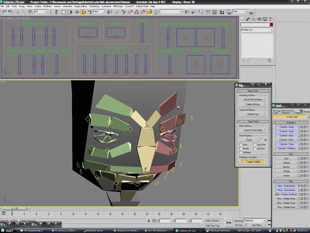 面部的设定是一套完整的骨骼系统。Paul Neale为我们进行了骨骼设定。这里面包含了许多脚本像旋转、删除关键帧、选择工具等等。他还设计了一个小工具用于面部的特殊动画需求。