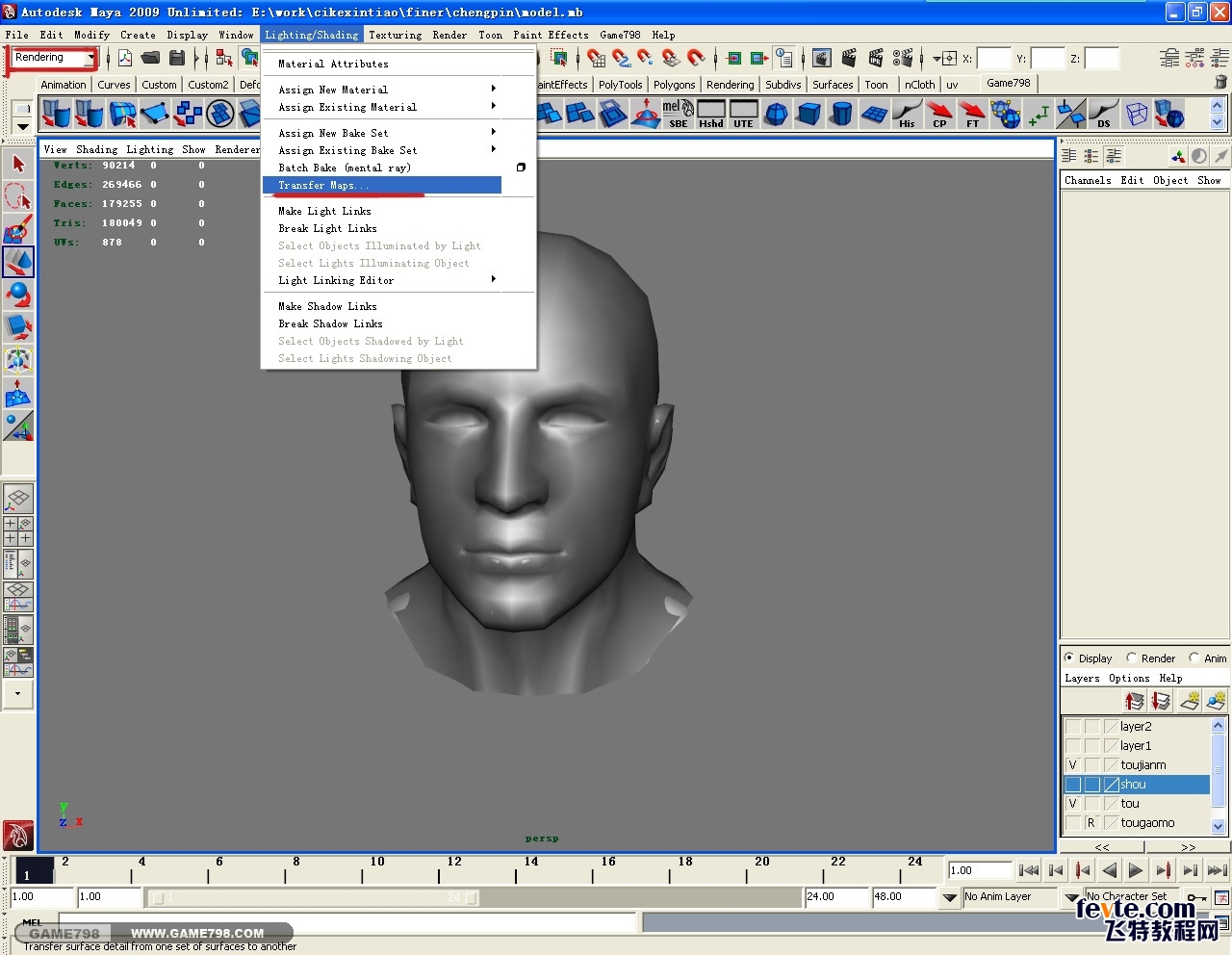 整合好UV,我们开始要做次世代最核心的一部分工作了,那就是烘培Normel贴图和AO贴图。把拓扑好的低模匹配好高模,在Rendering渲染模块下的Lighting/Shading菜单栏下打开Transfer Maps面板。如图: