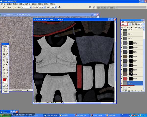 在前一段时间,本人写了一个盔甲贴图的教程,那是一篇如何制作金属贴图的教程,在这里我就着重的写写如何来制作布纹的贴图。因为AO的纹理不是很明显,我们可以借助法线贴图,打开法线贴图,按住Shift键配合移动工具把法线贴图拖入进来,放在AO贴图的下面,去色之后用正片叠低图层样式,现在我们就很清楚的看清布纹的纹路了。如图:
