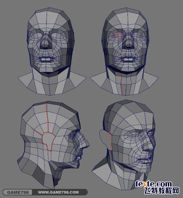 接下来就要开始细化五官了,这一步很重要,而且布线也是比较麻烦的,这种布线是根据结构和肌肉的走向来布的,对于没有美术基础的同学可能理解起来要稍微难一些,但我相信多练多去理解结构应该也是没问题的!