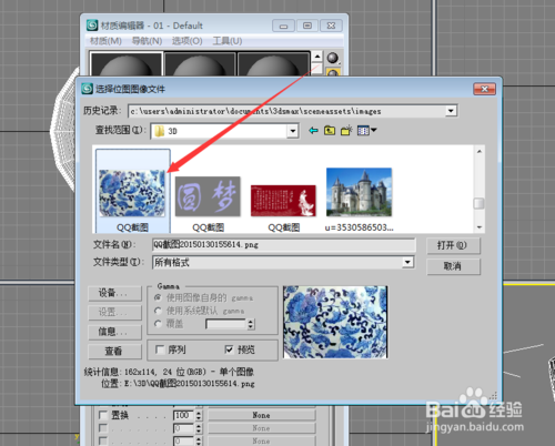 单击M键,打开材质编辑器,选择位图贴图,选择青花瓷图片(可以在网上搜索你喜欢的);