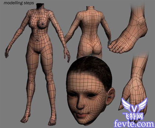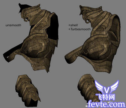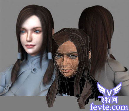 我用的是多边形建模。先做身体跟头部的一半,然后添加一个对称修改器和一个turbosmooth。我用一个平面来建盔甲,然后根据我的稿图通过剪切和连接来完成,接着用一个壳来增加厚度。腰带跟皮带也是用同样的方法。头发是用平面跟不透明贴图完成的。眉毛跟睫毛也是。我认为这样比毛发更快!