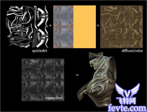 盔甲贴图我运用了一个叫做quickdirt的插件,在ps里面调整一些明暗区域不同的图片,然后用quickdirt就很容易。下一步就是在ps里面做好图片跟金属和泥土混合起来就可以了。我给合成效果添加了一个黄色的图层,产生一些光泽效果。高光就是不饱和的漫反射贴图,然后加一点光泽度跟对比度的调整。以下就是我的贴图效果:
