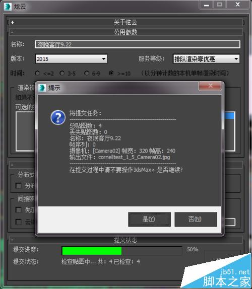 4、然后单击“渲染”菜单 -> “炫云”菜单项,出现如下图所示的“炫云”对话框,单击“提交”按钮。