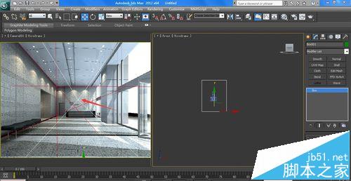 7、给box增加一份段,不断的调节相机与焦距,在顶视图上下移动box,让分段线的x轴与z轴都与图中的x轴和z轴对齐。找到相机焦距,是26。