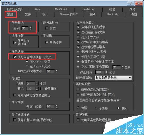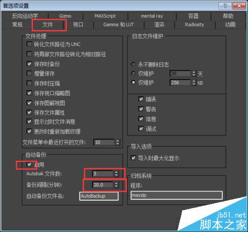 3、首选项的设置,第一就是场景撤销,一般新手会做错很多东西,所以后退的步数一定要够用啊!哈哈!场景选择:勾上之后就可以像CAD一样的有正选、反选的分别了!文件里面的自动保存,文件数太多也不好,到时候找起来麻烦,太少了时不时就要被刷新,依我的经验七八个就行,备份时间太少容易卡。