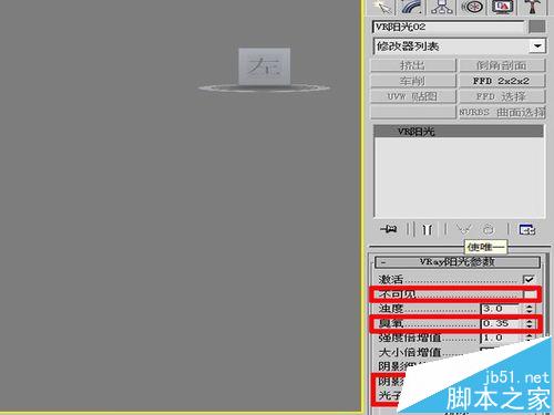 2、选择刚建的Vary 阳光,回到修改器,修改阳光参数,一般情况下不可见、臭氧、阴影偏移、光子发射半径不需要修改。