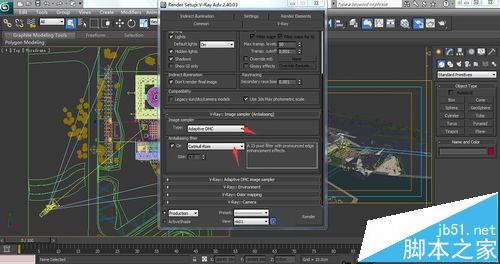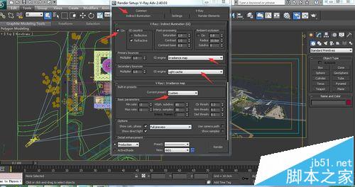 8、找到Indirect illumination下的GI打开,将下面的首次反弹Primary bounces和二次反弹Sencondary bounces下的GI image分别改为擦补贴图Irradiance map和灯光缓存light cache。并将Irradiance map中的current preset改为较高的值(-3,-1)和细分(80,30)。