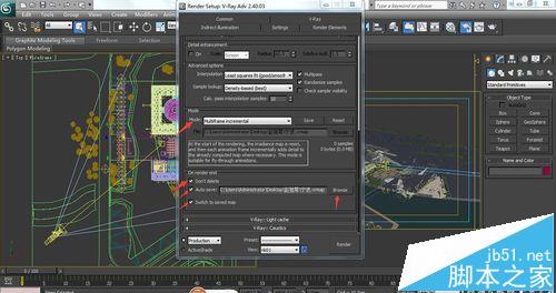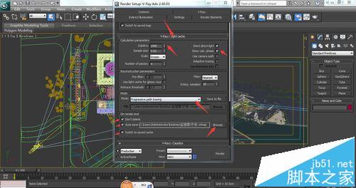 10、在灯光缓存中Light cache下更改细分值,一般经验值为1200与1500,再勾上如图所示右边的第二个勾,下面mode与On render end的设置与第九步相同。