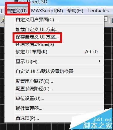 1、打开你的max软件,找到菜单栏的自定义设置,选择下拉栏中的保存ui方案