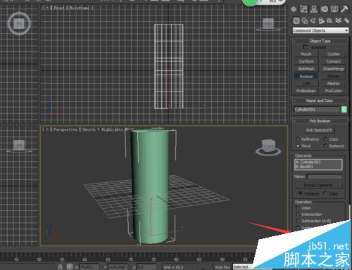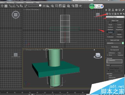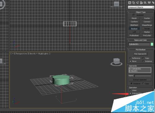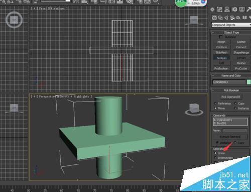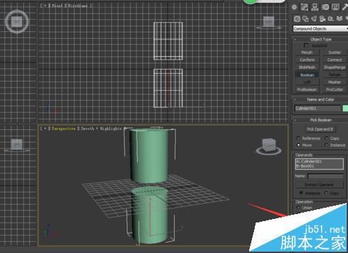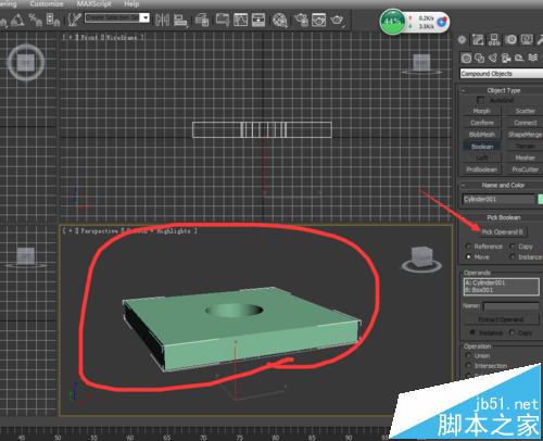 3、选择boolean之后,我们看到有个pick operandB 这个就是拾取运算的对象,我们选择圆柱体,如图所示,我没看他们的交合部分就流出来了,