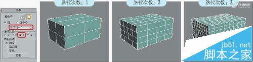 在场景中创建一个长方体。添加[细化]修改器列,在属性面板[参数]卷展栏中设置[张力]值为0,可以看到长方体添加了分段。依次修改[迭代次数]选项,可以看到随着[迭代次数]的提高,长方体上的分段数也随之增加。这里选择[迭代次数]为3,如下图所示。