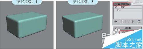 继续为长方体添加[网格平滑]修改器,可以看到长方体变成了倒角方体,之前所有带棱角的位置变成了光滑的曲面,如下图(左)所示。在属性面板[细分量]卷展栏中设置[迭代次数],并观察长方体。可以看到随着[迭代次数]值的提高,长方体上形成的曲面也越细致光滑,如下图(右)所示。