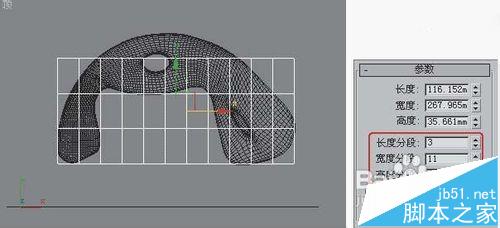 在顶视图中,参照立面体图形的位置和大小创建一个长方体,在属性面板的[参数]卷展栏中设置[长度分段]值为3,[宽度分段]值为11,[高度分段]值为1,如下图所示。