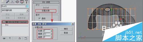 选择长方体,在[修改]面板的修改器列表中选择[FFD(长方体)]选项,在[FFD参数]卷展栏中单击[设置点数]按钮,在弹出的[设置FFD尺寸]对话框中设置[长度]和[高度]值为2,[宽度]值为11,单击[确定]按钮,如下图所示。进入[FFD(长方体)]的控制点层级,通过拖曳来控制点与图形外边缘大致吻合。