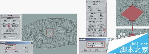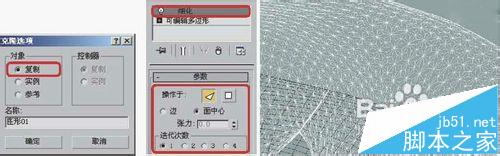 选择模型,执行菜单[编辑]|[克隆]命令,在弹出的[克隆选项]对话框中设置[对象]属性为[复制],如下图(左)所示,单击[确定]按钮复制出一个新的模型。通过右键菜单转换为可编辑多边形,添加[细化]修改器。在[参数]卷展栏中单击张力按钮,设置[张力]值为0,选择[面中心]选项,可以看到模型上产生了大量的肌理,如下图(右)所示。