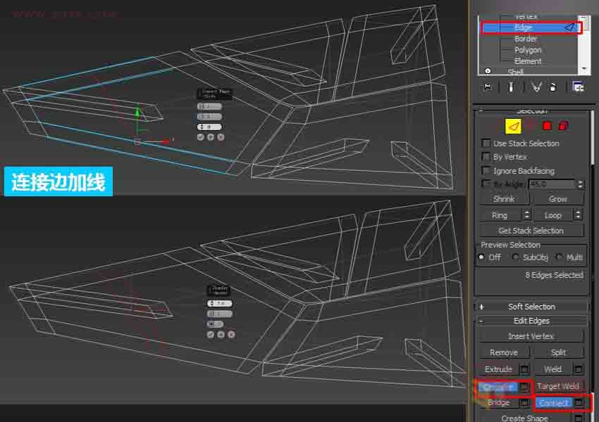 连接边加线,缩放调点成形体,注意参考图片噢。