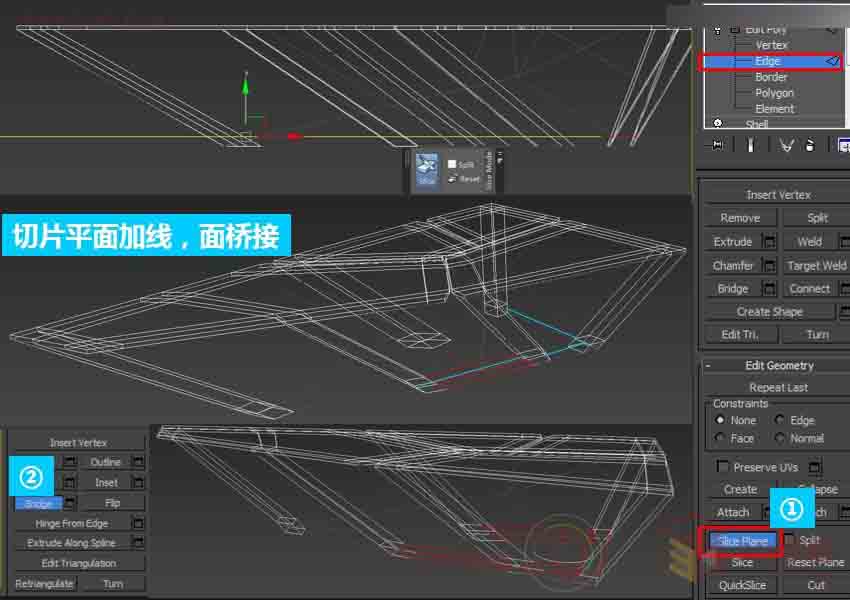 在边级别下,使用切片平面(Slice plane)加线,选中底部的面进行桥接。