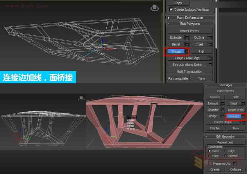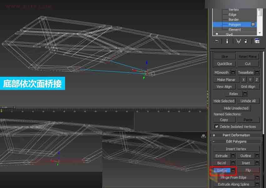 顶部的面挤出,边连接加线,与底部转角处的面进行桥接。