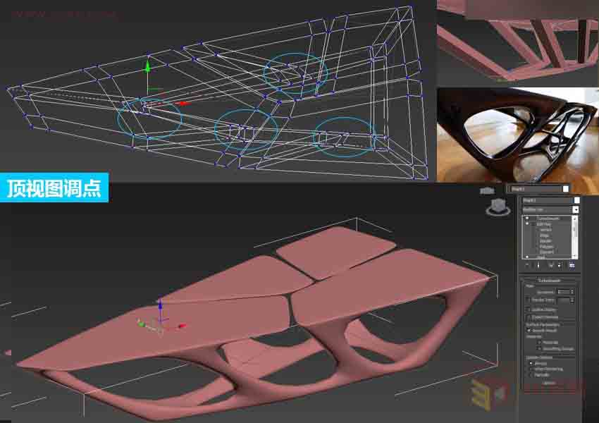 主要是Poly多边形编辑,首先绘制样线条作为参考,Poly布线,分段、桥接等编辑,涡轮平滑(TurboSmooth)效果。
