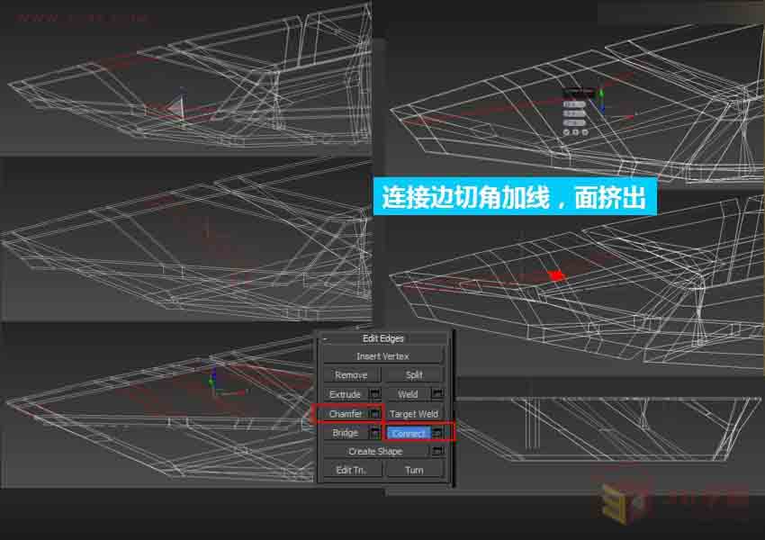 循环选择边,连接边加线,对连接的边进行切角,再次加线。