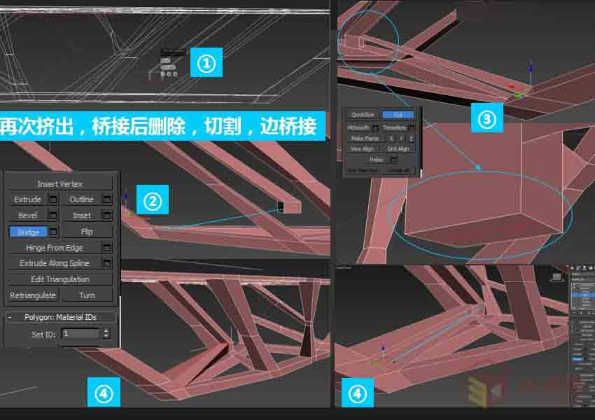 注意这里的特殊性:再次挤出一定高度形成面后发现桥接不对劲,我们需要桥接后删除对应的面,在上一步挤出的那个面上进行切割一次,才能将对应的边进行桥接完好。