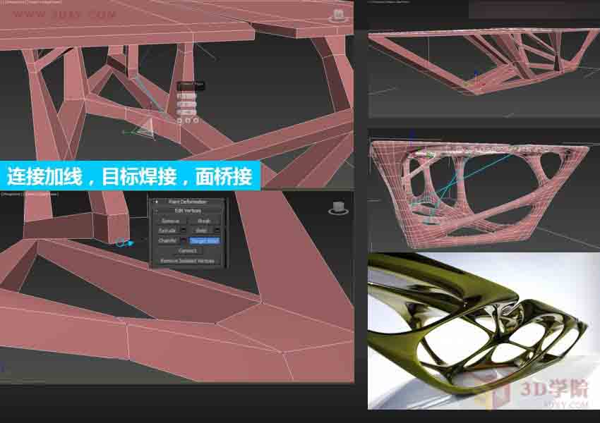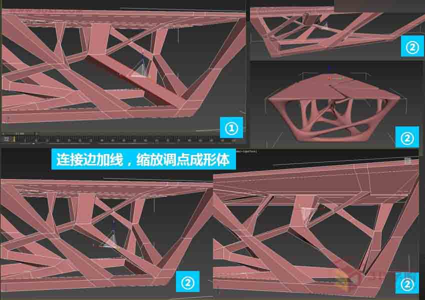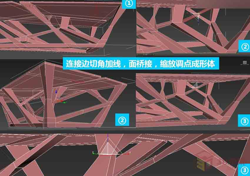 继续连接边切角加线以形成我们需要的面,与中间交叉处的面进行桥接,缩放调点成形体。