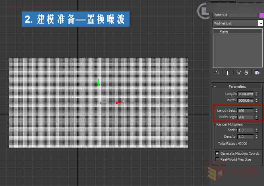 第一步:创建一个高分段数分段的面片(Plane)。