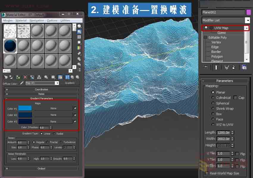 添加贴图坐标修改器,注意渐变海洋蓝色。