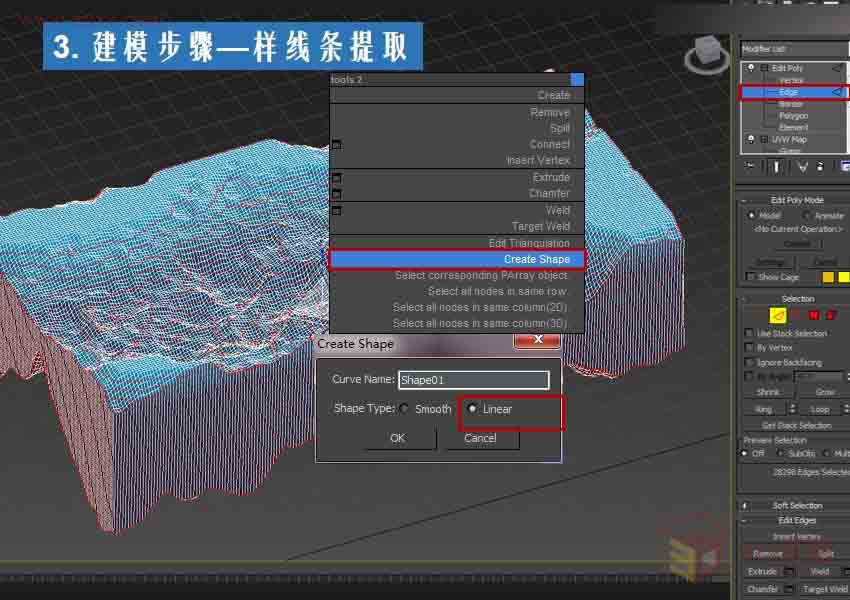 第十步:当你依次切割完成后,进入线层级你会发现,刚才切的线处于选中状态。这样你可以直接提线(Creat Shape),注意看提取线类型。