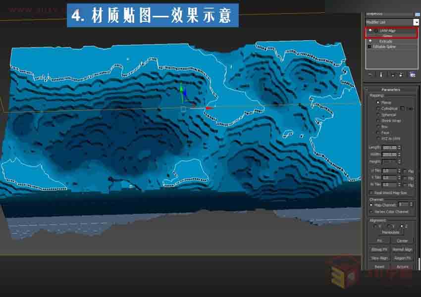 第十三步:挤出完成后,我们在顶视图将上面的海洋地形部分赋予我们之前的渐变材质,添加贴图坐标修改器。