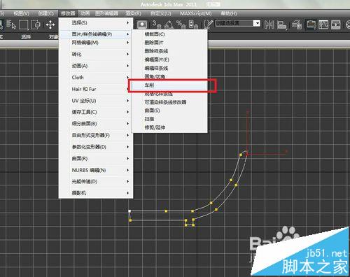2、我们需要将这个二维线条转换成三维模型,那么,就需要使用车削命令了。车削说简单点就是车刀在平面内作直线或曲线移动的切削加工。我们点击菜单栏-修改器-面片/样条线编辑-车削