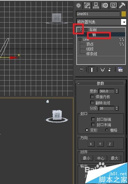 4、车削在车床上的加工一般还需要调节对齐轴向和对齐位置,调整完毕。才能得到正确结果。那么怎么修改呢,我们就要用到轴线的知识了。这里我们按住鼠标左键拉选整个模型,在修改面板点击灯泡图标将灯灭掉,再点击轴。