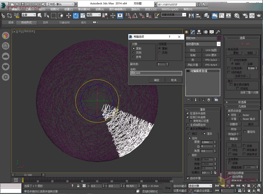 5,画好线以后点右键停止,在修改面板中,将在渲染中启用和视口中启用打开,调节厚度,为减少模型面数,边没必要太多。