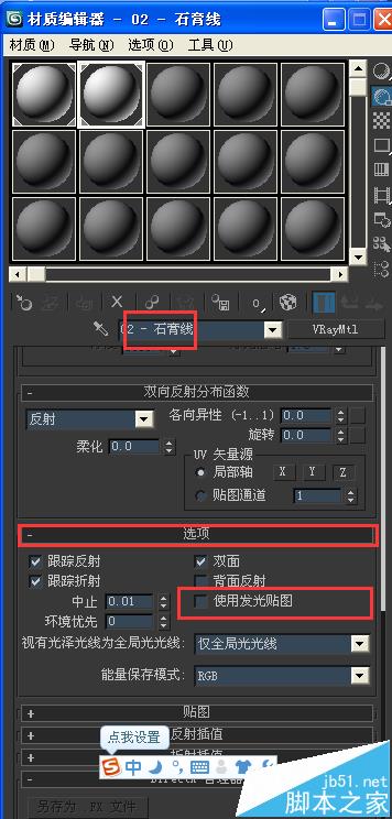 3、好了,下面就开始亮大招了!按M把材质编辑器打开→调整石膏线的材质→展开选项→将使用发光贴图的小勾勾去掉,如果是草图的话灯光缓存的细分值再大一点,不论小图大图细分在500以上基本就ok了! 什么你不相信?那就看看效果吧!