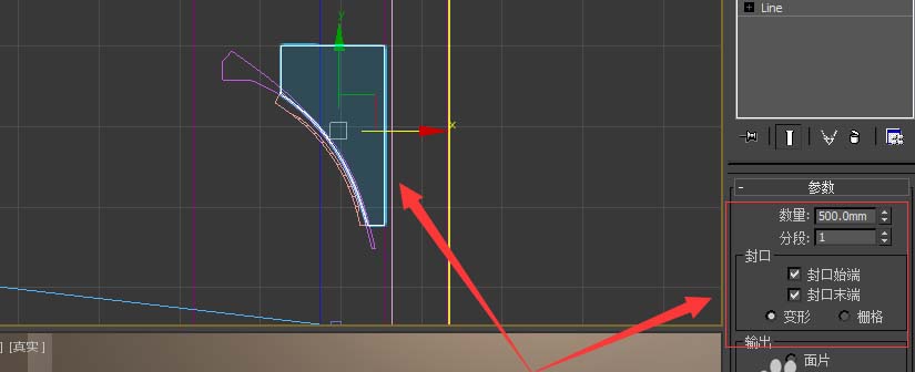 6、再次使用“线”工具,绘制风道横截面图,使用挤出修改器,并调整参数及位置;