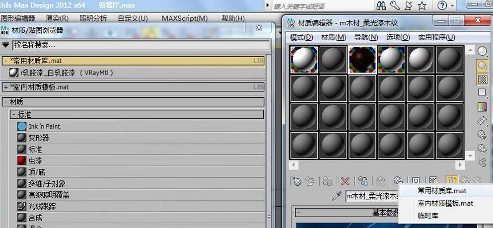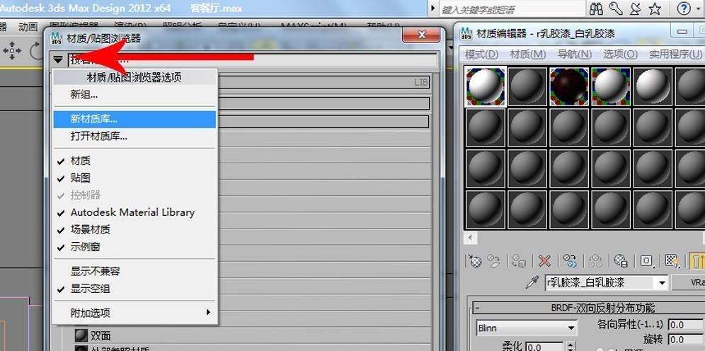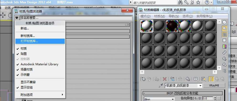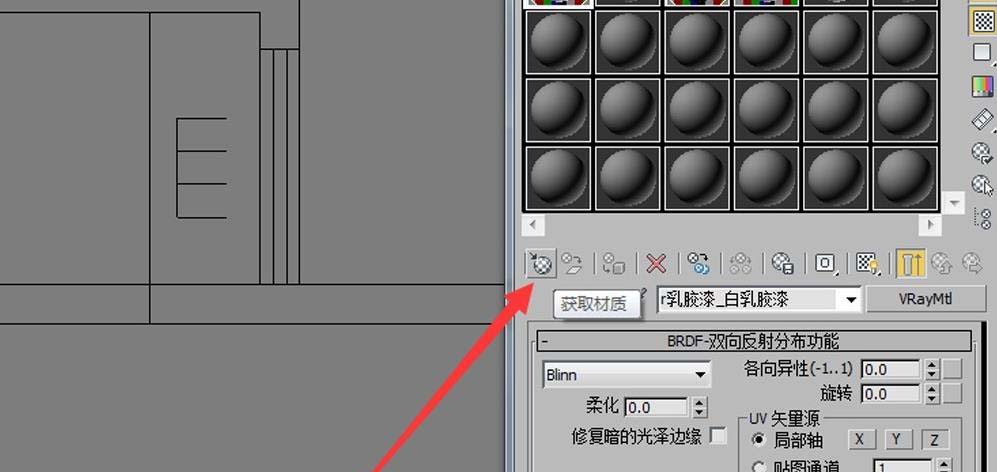 1、打开3ds max,按快捷键M调出材质库,本例乳胶漆为例。先按图示调出乳胶漆材质