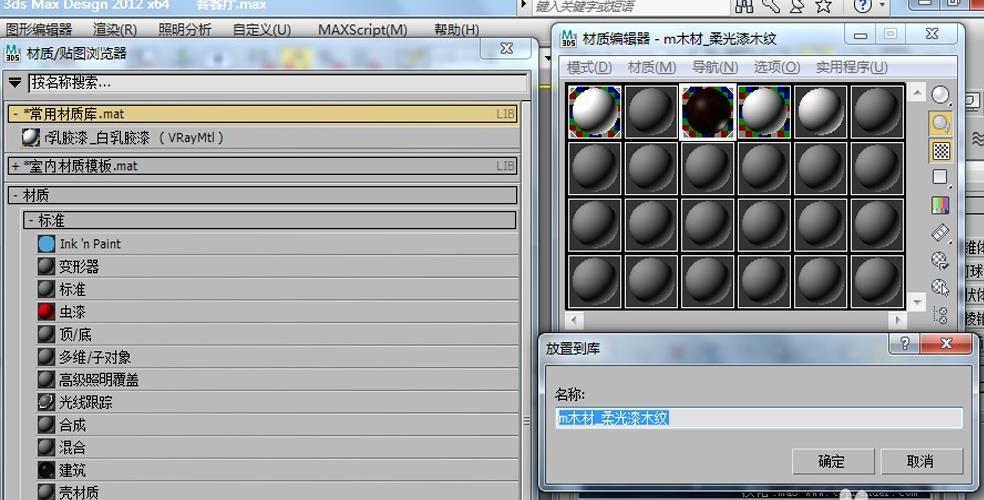 4、选择需要保存的位置,然后命名材质库,点击保存,然后在在材质编辑器上点击放入库按钮,这是保存好的第一个材质。