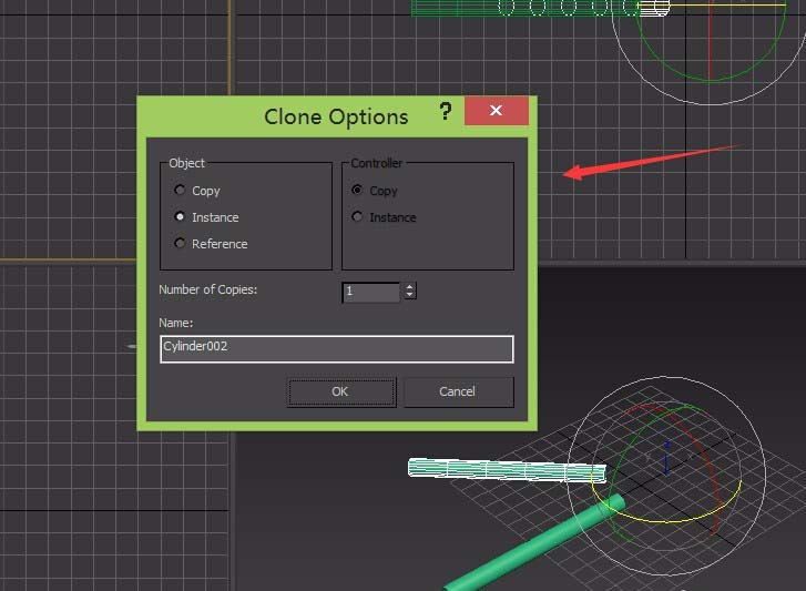 6、选择这个圆柱体,按键键盘上的E键,转换为旋转状态,再按下键盘上的SHIFT键弹出clone option窗口,如图所示: