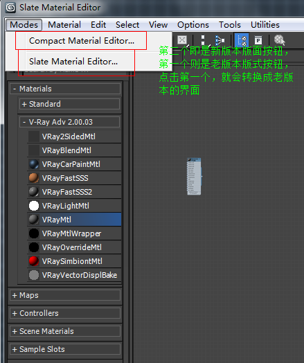 3dmax2010的材质编辑器如图,而3dmax2012是这样的,auto公司为了使用者在两种不同版面的材质编辑器之间转换,是提供了新版本转成老版本的,如图。。