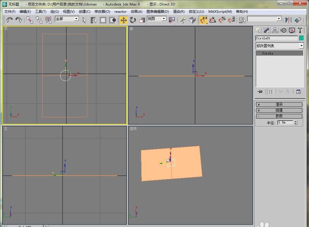 5、设置这个圆的半径为1.8m,然后结合前视图和左视图,将圆移到长方体上方。