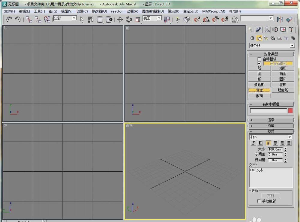 2、在创建面板里选择样条线,在样条线下有文本。文本会经常使用,大家一定要会用
