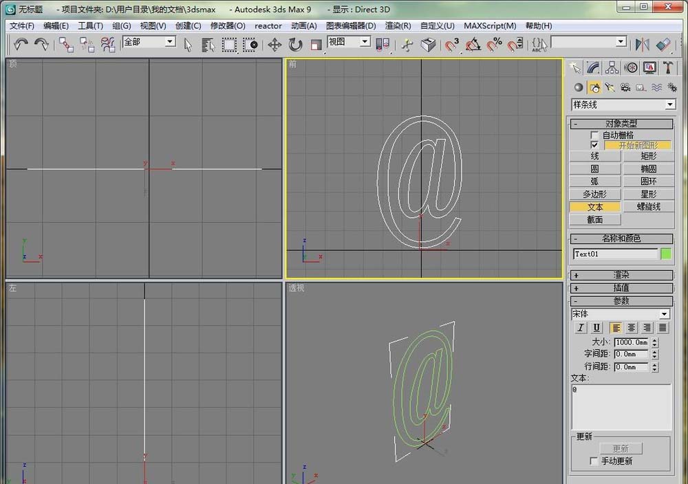 3、在文本里输入字符@,然后显示在前视图里。大小自己根据需要设置。