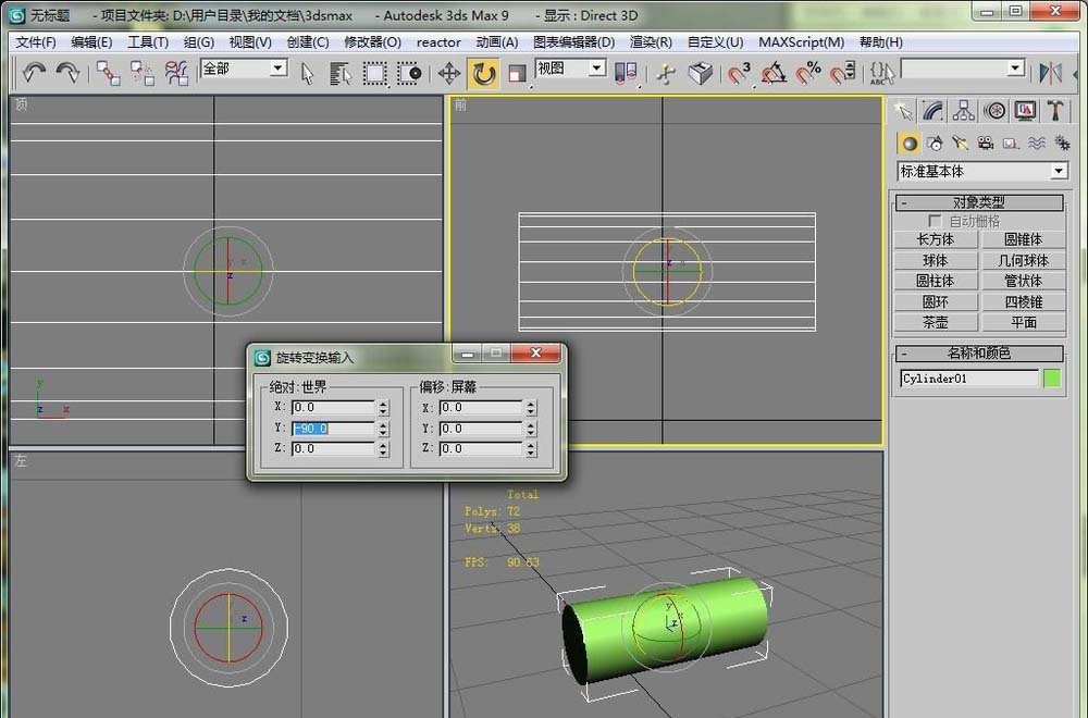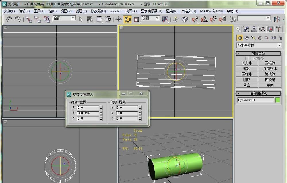 3、直接选择旋转工具,然后就可以在视图里旋转圆柱体了。这里在前视图比较好操作。