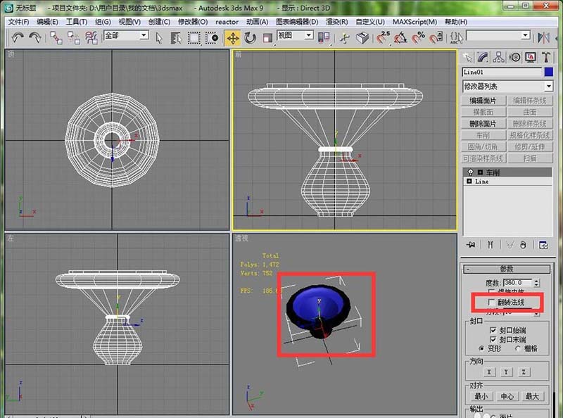4、然后对线进行车削,如果车削之后模型的颜色在里面,而外侧是黑的,只需要勾选“翻转法线”