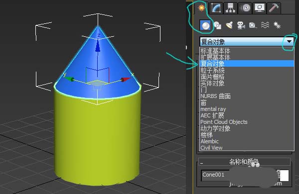 2、选中其中一个物体,在创建栏里选择“复合对象”。